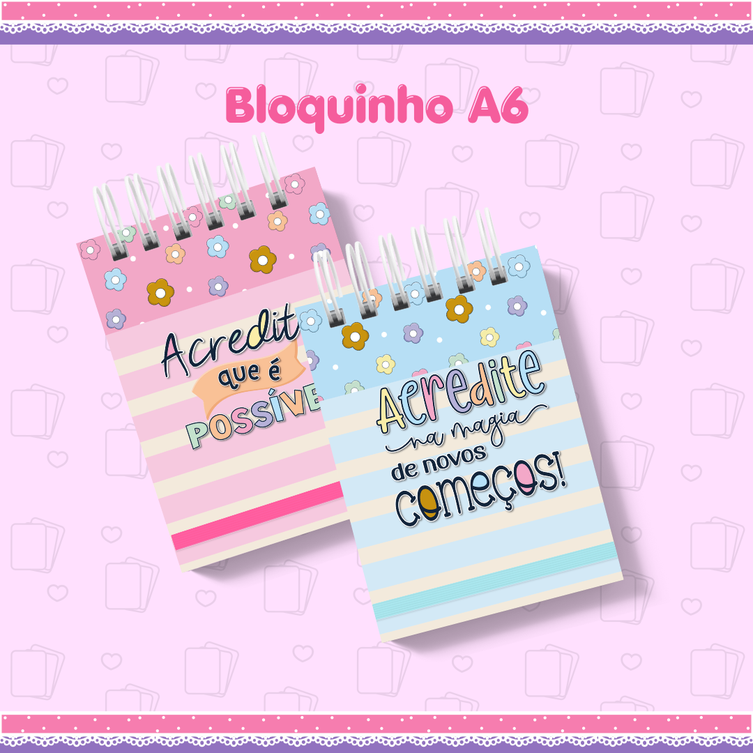 Bloquinho de anotações tamanho A6 com 100 folhas brancas (gramatura 75g).